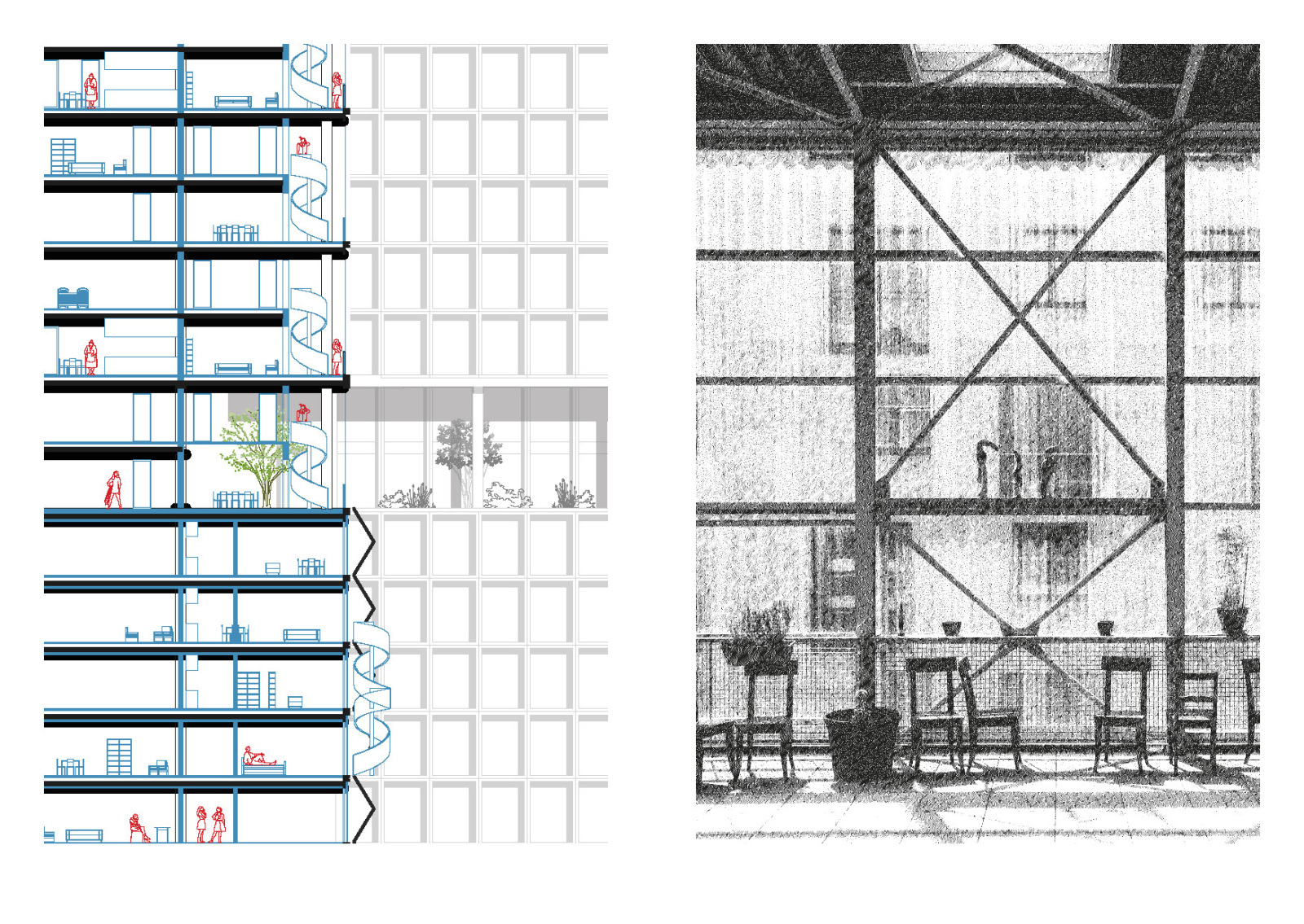The reserach outlines the vision for the reconversion of the Proximus Tower in the Brussels North area, focusing on how verticality and mixed-use can coexist harmoniously. It emphasizes the goal of creating continuity between floors while respecting the historical significance of the twin towers, likened to Fred and Ginger dancing together.