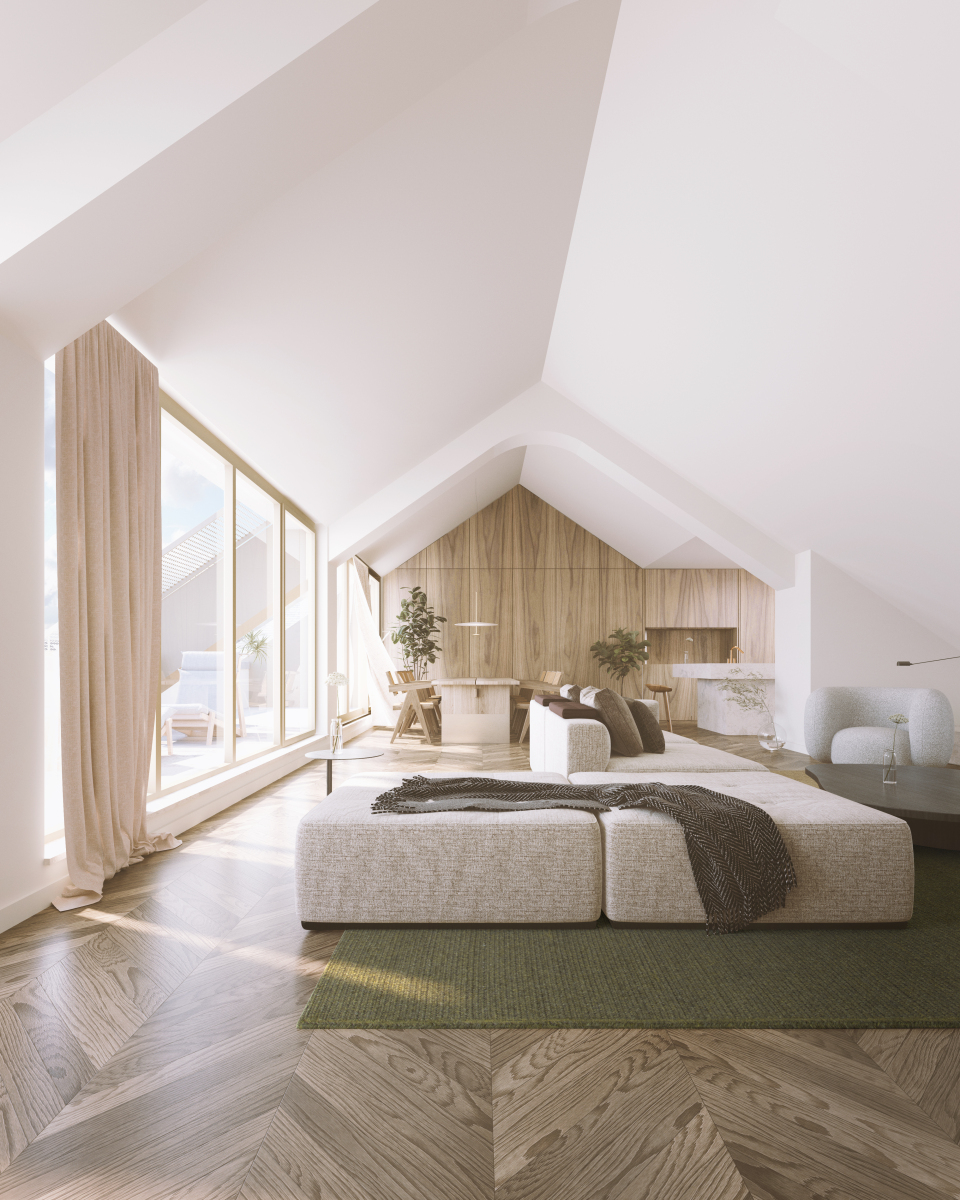 Behind this composed exterior lies a very different reality. The internal structure and rear façade stem largely from a 1970s renovation, speaking another architectural language. Rather than concealing this contrast, the design uses it as a starting point. The apartments become spatial connectors between front and back, while targeted interventions give the rear façade a renewed presence. Windows are refined, proportions adjusted, and new openings carefully inserted. What once was a secondary elevation gradually takes on the character of a new front.