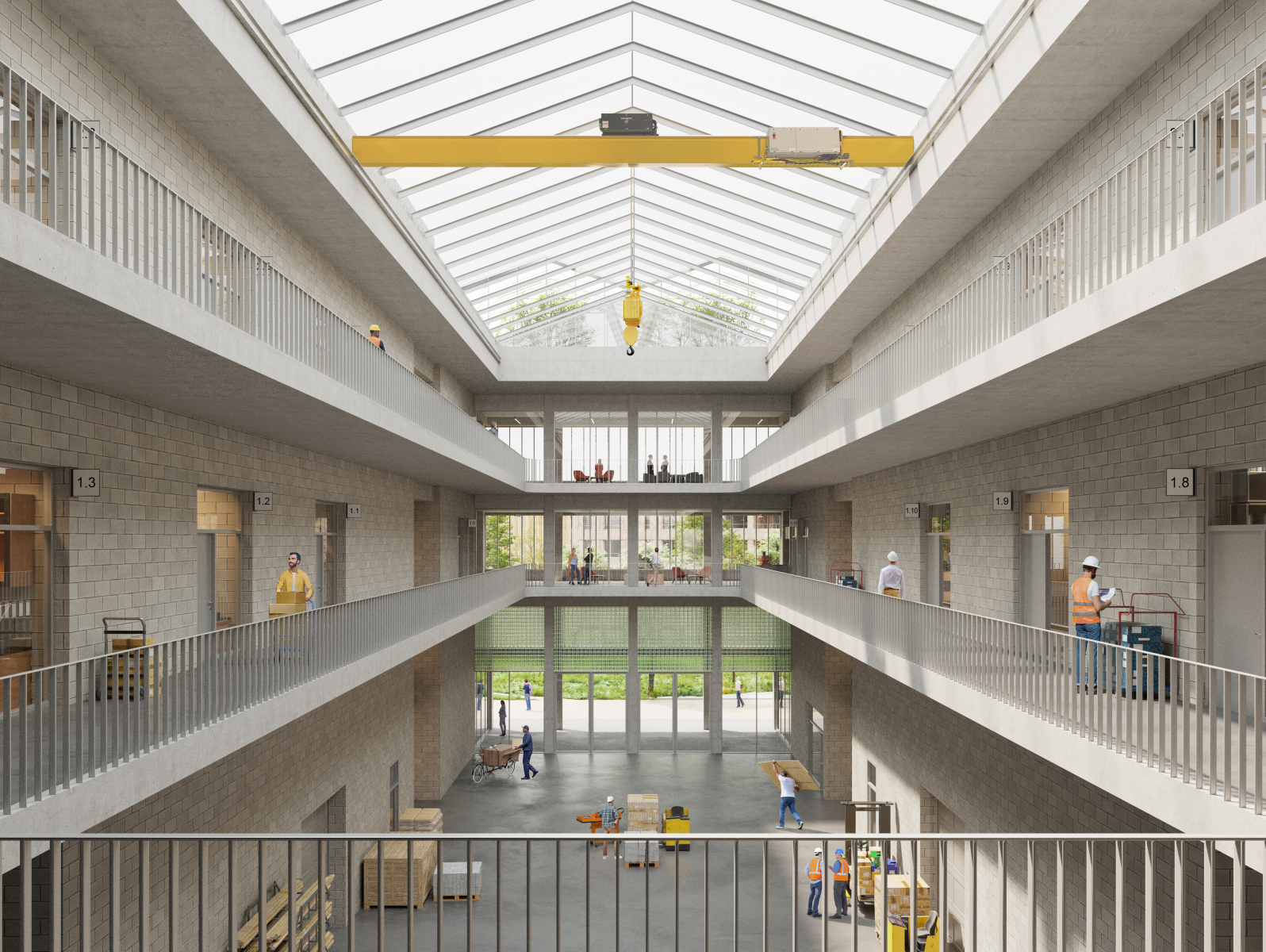 By organizing the workshops in a cross-shaped layout, circulation transcends a purely logistical approach. In addition to loading and unloading areas, the inner street also accommodates meeting places, exhibition spaces, and a covered market. By linking this inner street to the surrounding public spaces, the productive heart of the project becomes tangible.