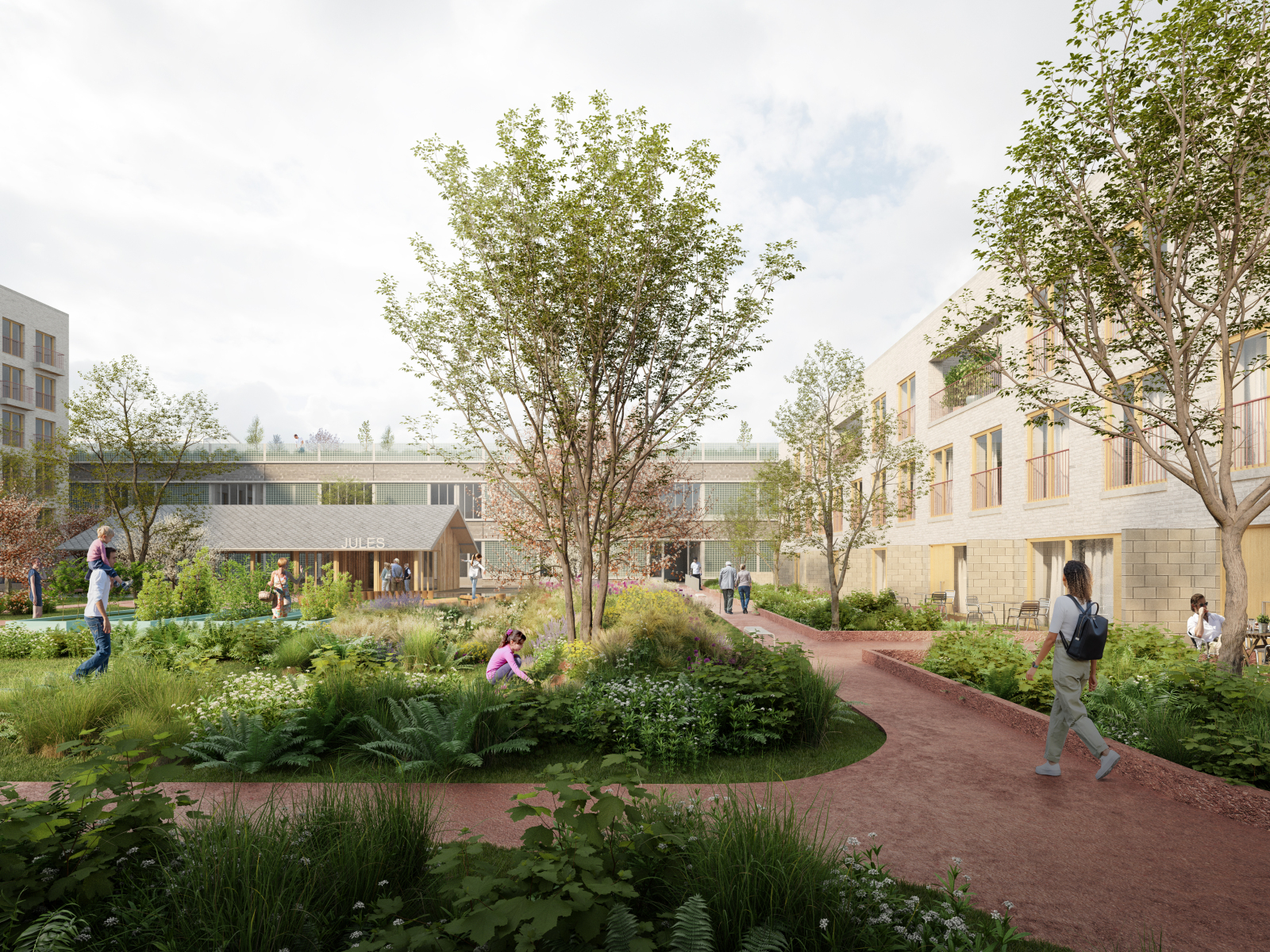 The architecture reinforces this fine-grained urban fabric. Large industrial buildings with closed façades give way to compact building blocks with diverse typologies: through-apartments, courtyard housing, affordable units, and mixed-use buildings where living and working coexist. Everything is designed with particular attention to the human scale, especially at ground level. Productive workshops, a neighborhood café, and local shops activate the street level and enhance the vibrancy of the district.