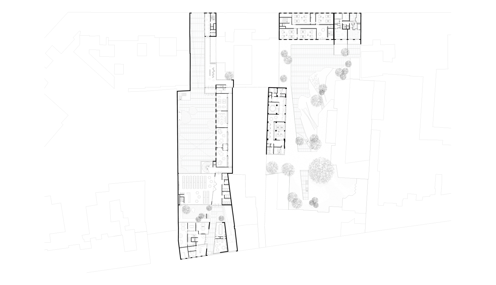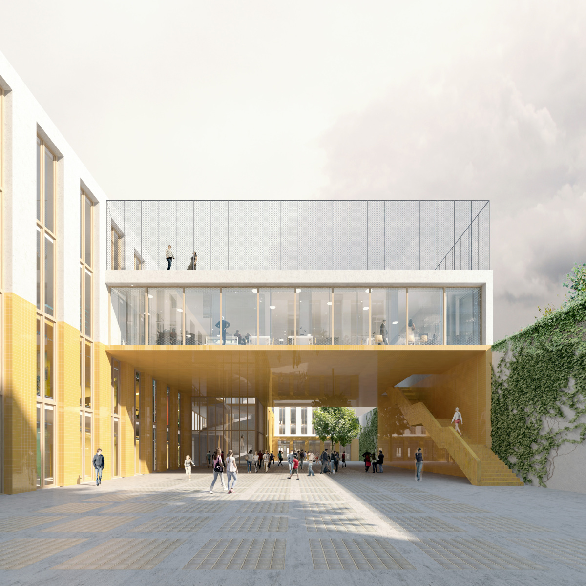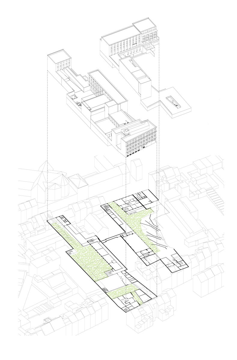 The Gallait terrain was chosen as the site for developing a shared campus for several Dutch speaking primary and secondary schools in the Brussels Capital Region. The Gallait terrain is situated in a closed building block between the Gallait Street and Vanderlinden Street in Schaarbeek, Brussels. The competition, organised according to a design & build procedure, invited participating consortia to explore the opportunity of acquiring adjacent terrains on top of the school properties on site, in order to be able to develop a functional school campus. As such, the bid prepared by this consortium involves two inner areas within the building block, which are being linked together by transforming a former depot building and a party room and making these structures the hinge between the two inner areas. The site becomes a campus for a community school [brede school]. This means that the campus becomes the site for community interaction by facilitating multiple use of spaces, especially after school hours. In the first place, commonality is facilitated in the outdoor spaces of the campus which is created by organising the campus in separate built volumes. These are diverse and accessible, they invite people to meet up, to relax and to explore. During a day, outdoor spaces may be demarcated and appropriated temporarily for educational purposes, while after school hours, the spaces may be transferred to actors from the neighbourhood to facilitate informal public use and community activities. Working with height differences, playful elements and plantings, the design invites adventurous play and physical movement. Educational spaces are organised around the terraces and as part of the roof gardens. Thus, the community school makes the world of children accessible to the neighbourhood. Reversely, the outside world enters into the classroom to broaden the perspectives of children. In the interconnected building volumes, diverse sorts of spaces are organised, so that the infrastructure may cater to activities beyond those of a traditional school day. There are spaces for meeting, reception, for deliberation and participation, for co-creation, for healthcare, day care and student support. Special attention goes out to extending and transforming the traditional class rooms, which become instruction rooms organised around open learning platforms. Buildings and outdoor spaces all have their own functionality an spatial logic, making them potentially independent, ensuring flexibility in the face of changing requirements in the future.